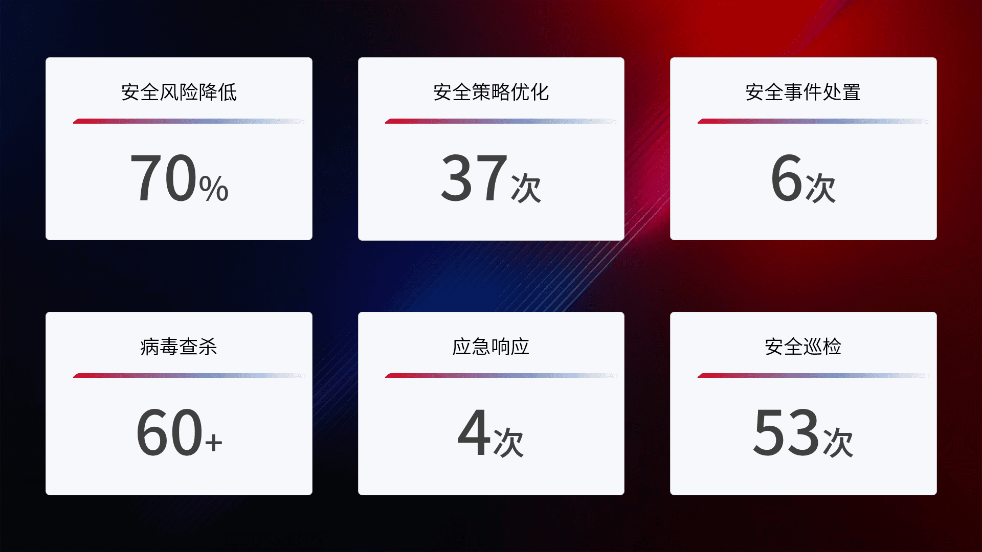 提供全面的安全事件报告体系,,,,包括处置报告、、周报、、、、季度和年度总结,,,,结合持续监控,,帮助客户深入了解网络安全状况。。。