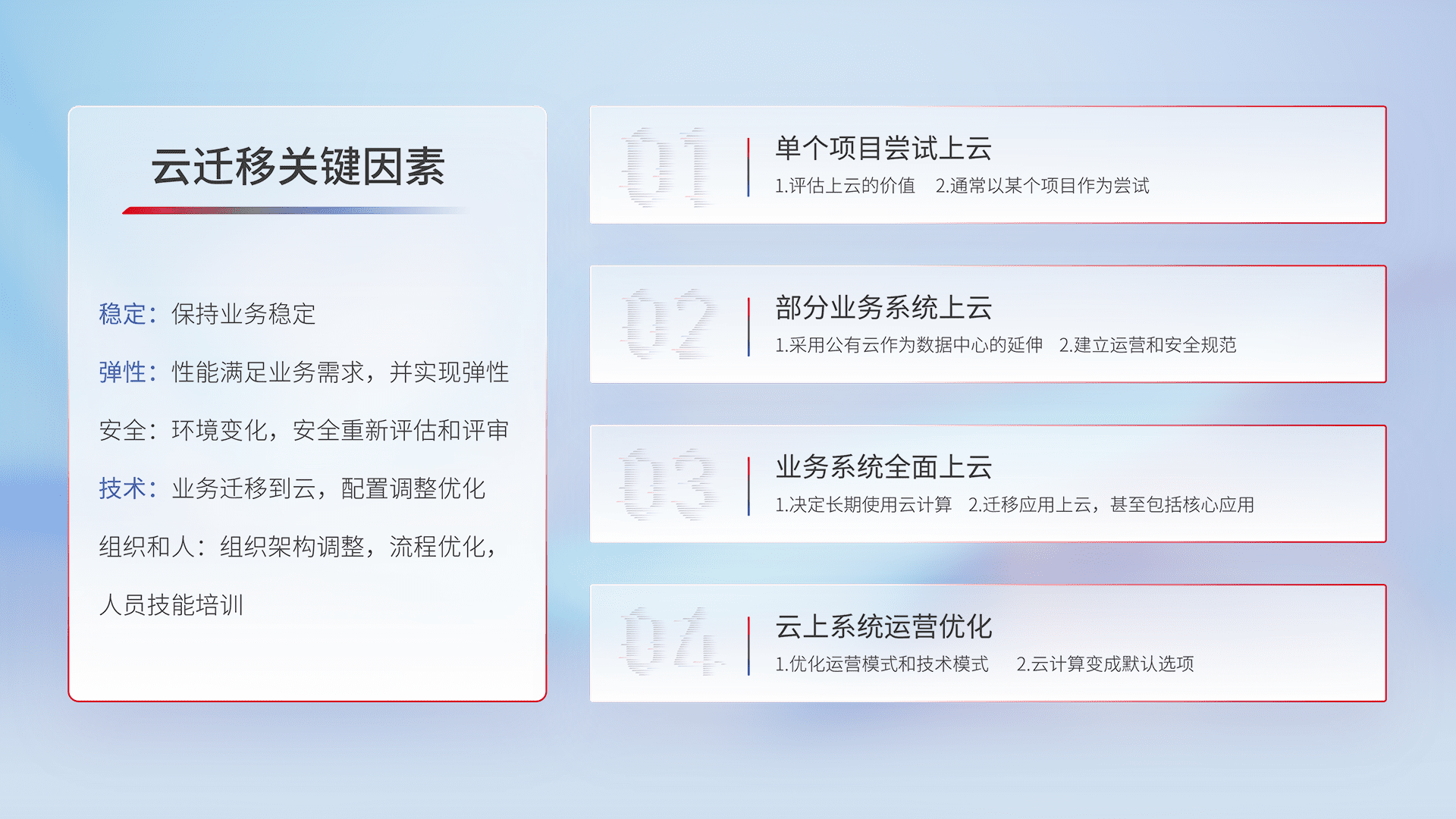 结合实际业务,,,从规划设计、、、、云平台选型、、云原生改造、、、数据迁移、、、、集成交付,,,迁移全过程为客户识别最佳上云路径,,,做好风险识别管理,,设计网络架构、、、、身份权限、、、、安全审计合规、、操作审计、、、日志审计、、、、监控告警策略、、多站点容灾设计等,,对云上基础设施进行整体规划,,,,提升IT治理水平,,,,以满足弹性、、、、高可用、、、、高性能的需求。。。