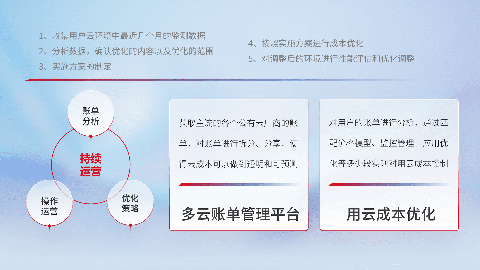 通过多云纳管,,,以统一的资源数据模型把客户的云资源进行抽象和封装,,,进而实现对多云资源的统一操作,,保障云资源管理的可靠性、、稳定性与可用性。。。量身定制化运维内容,,,,配置、、、、开发运维、、、、补丁管理、、、备份、、、监控、、、、认证和访问管理、、审计和日常巡检等,,,保障在用云过程中的可靠度,,稳定度以及高可用率。。。