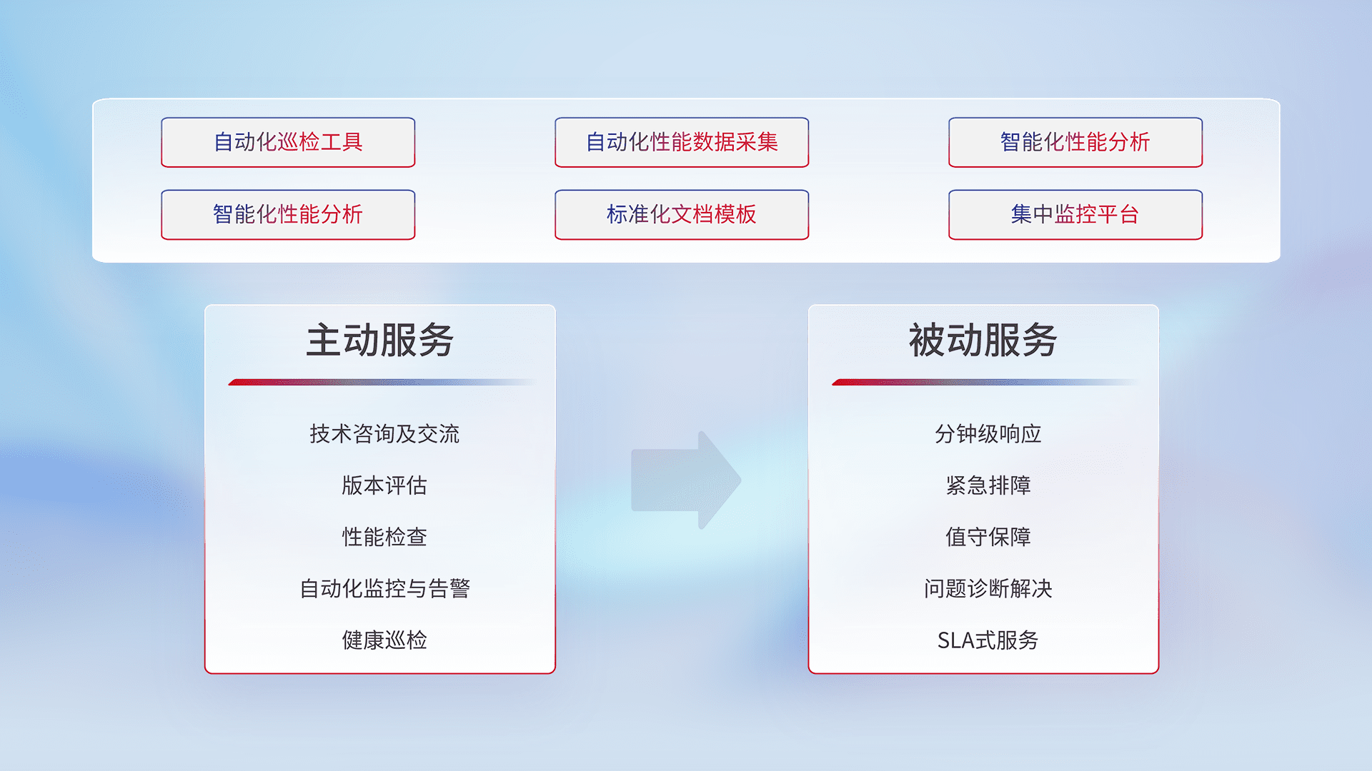 智能化工具和标准化文档,,,,保障服务质量,,提供主动服务(包含技术咨询、、、版本评估、、、性能检查、、、、自动化监控与告警、、健康巡检)和被动服务包含(分钟级响应、、紧急排障、、、值守保障、、问题诊断解决、、SLA服务)。。。。